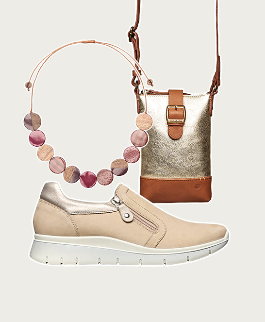 Beige Women's side zip trainer shoe with metallic detailing